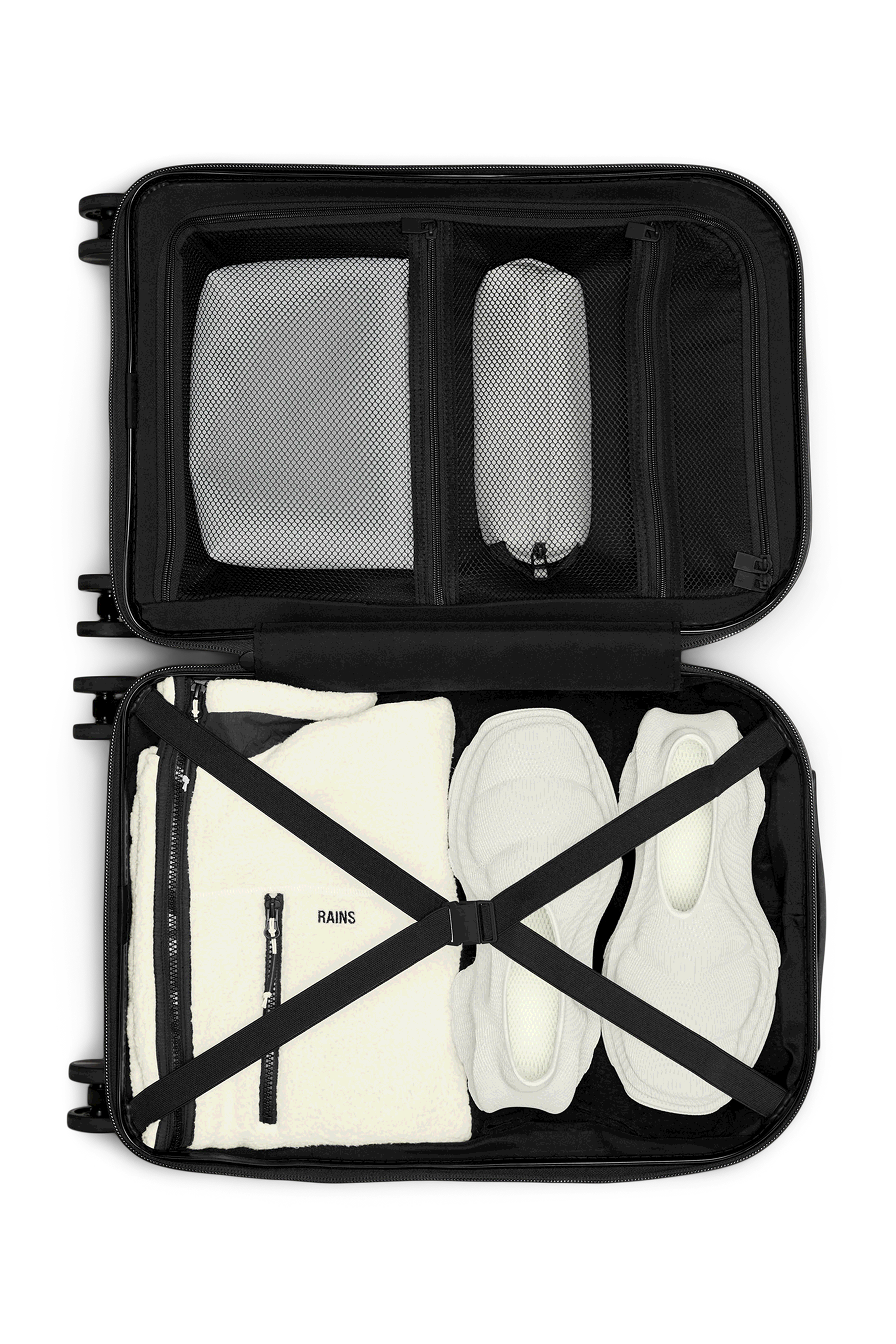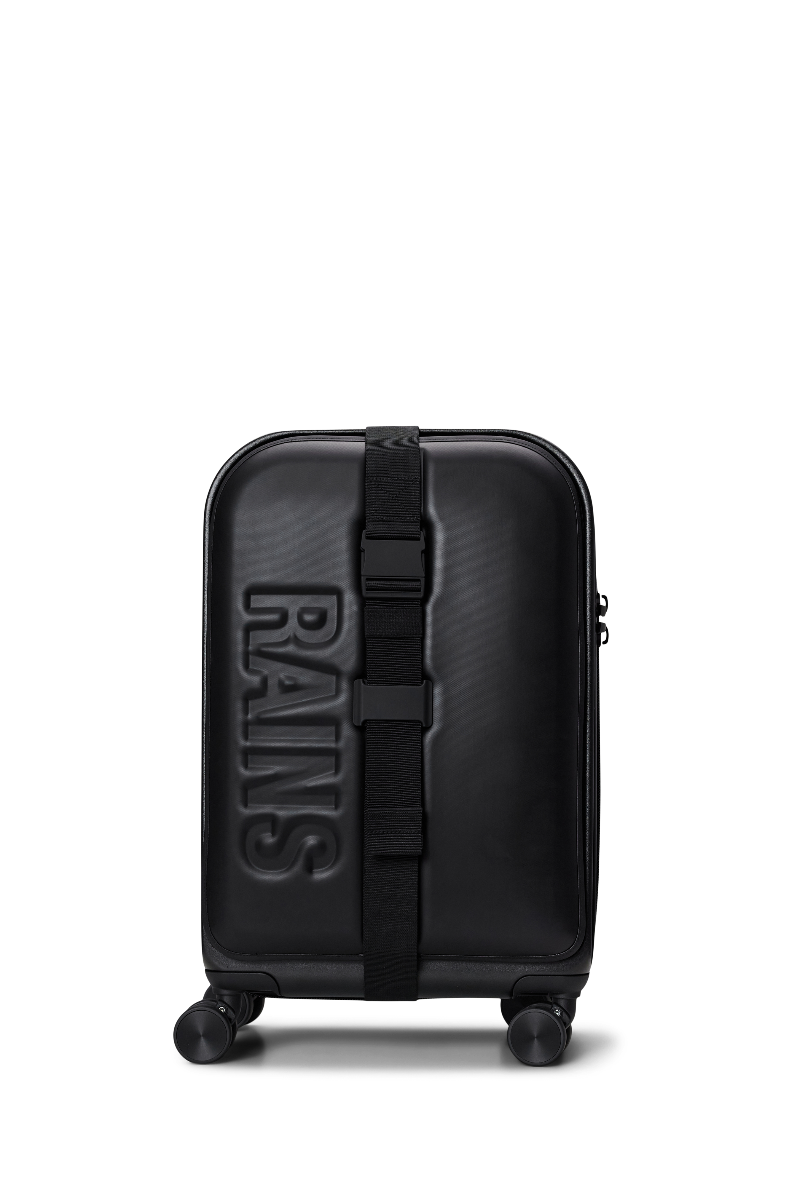 Wheel on, wheel off. Rains’ carry-on suitcase glides effortlessly on four multi-directional wheels. Made from durable polycarbonate, the waterproof bi-fold body boasts two spacious compartments and secures with a TSA-approved integrated lock. Raise the telescopic handle to a level that’s comfortable for you.
