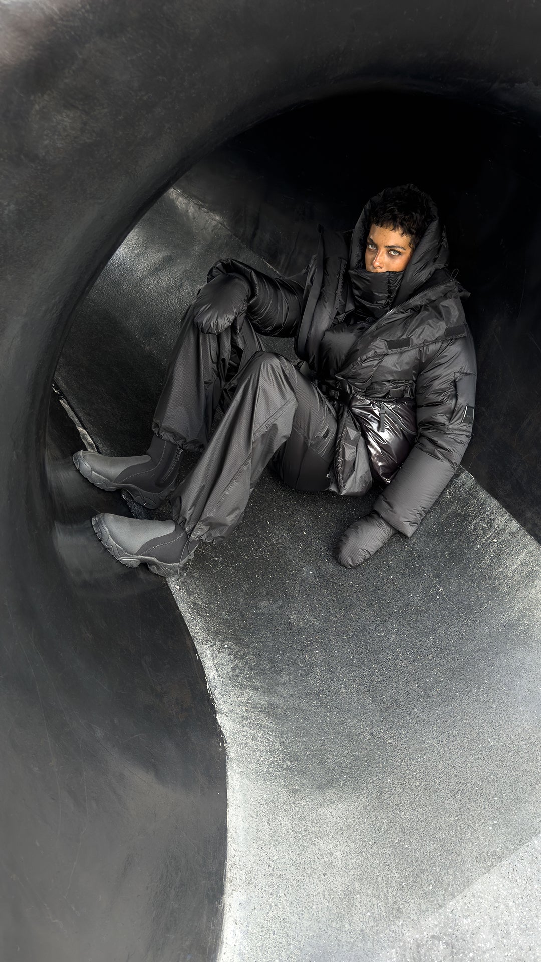 Design is made with a loose top-layer of nylon-ripstop. The silhouette is completed with a semi-transparent and soft matte finish.