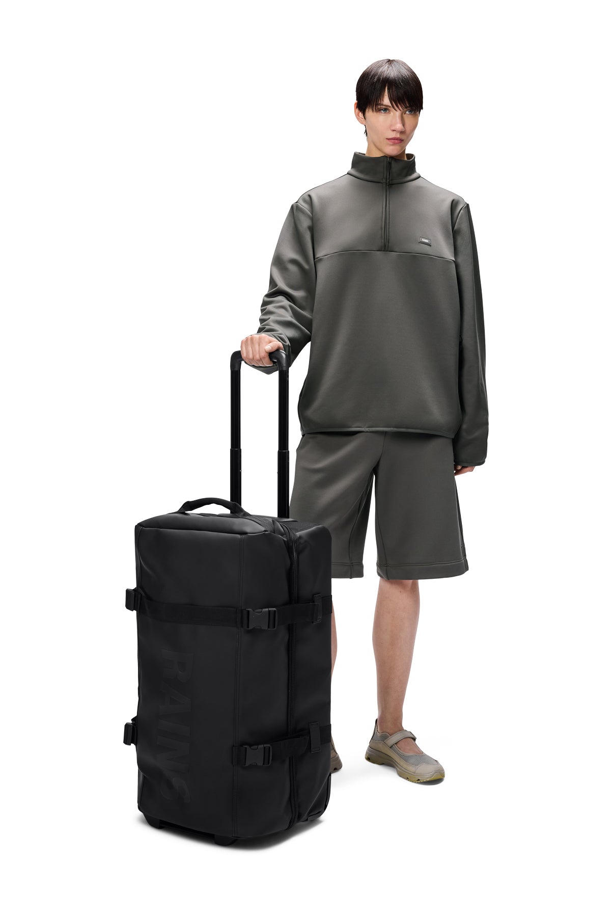 A travel-ready trolley bag in check-in dimensions. Cut from waterproof PU fabric.