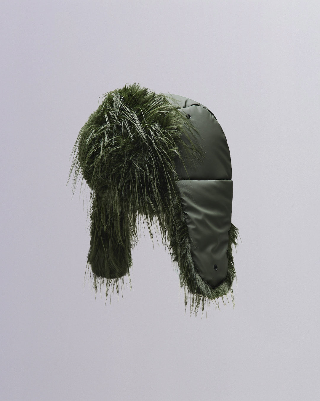 Expressive fleece with a waterproof PU base and side snaps to lift the ear flaps.Â