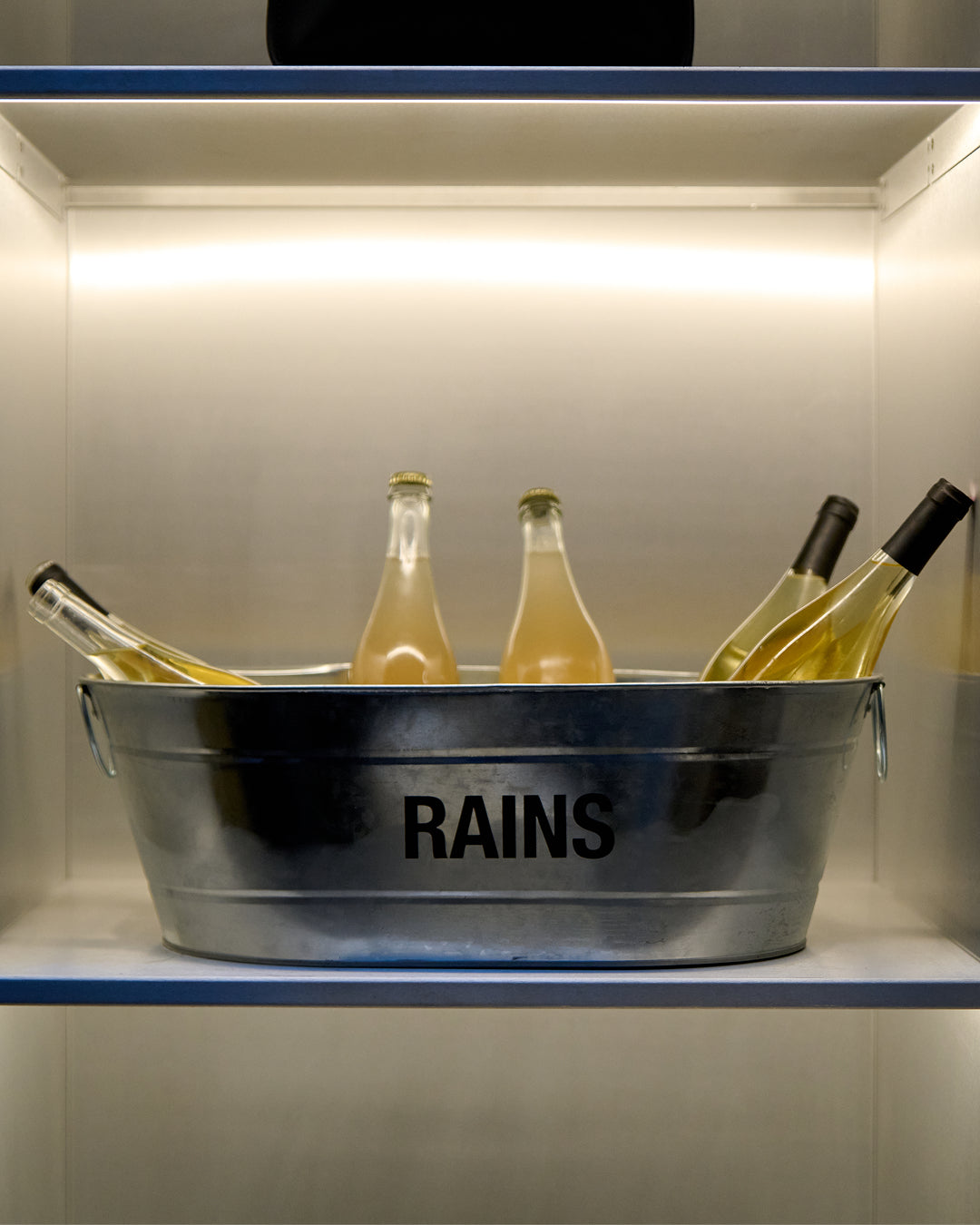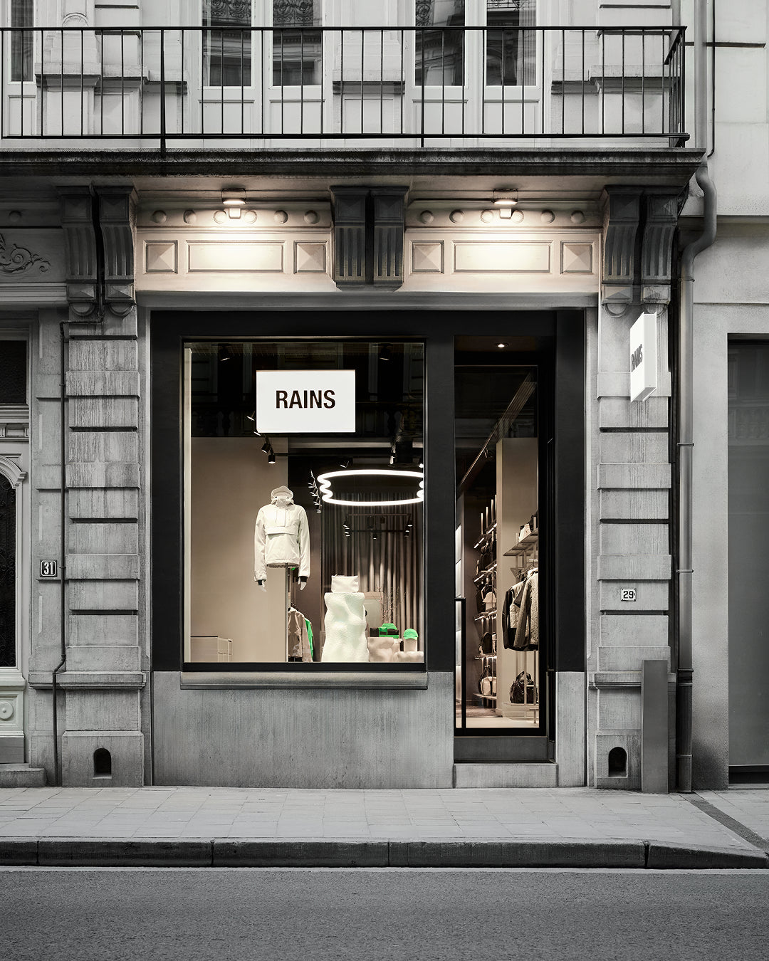 Rains brings its signature conceptual approach into the design of this space in the heart of Brussels. Hanging above the store is a custom-designed light fixture — a cloud-like sculpture that adapts its light to match the city’s ever-changing weather. A thoughtful detail that speaks to our legacy as an all-weather brand.Â